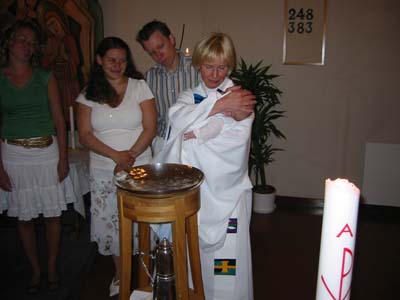 Pappa häller vatten i dopfunten. |