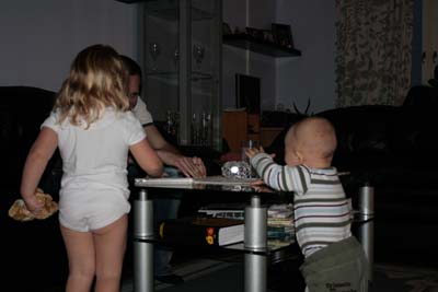 Jag och Emilia leker med hennes present från mig. |